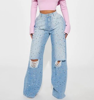 High Quality Chic Sparkly Ripped Loose Jeans Ladies Fashionable Mid Rise Denim Pants With Sequins Detail Casual Outdoor Wear